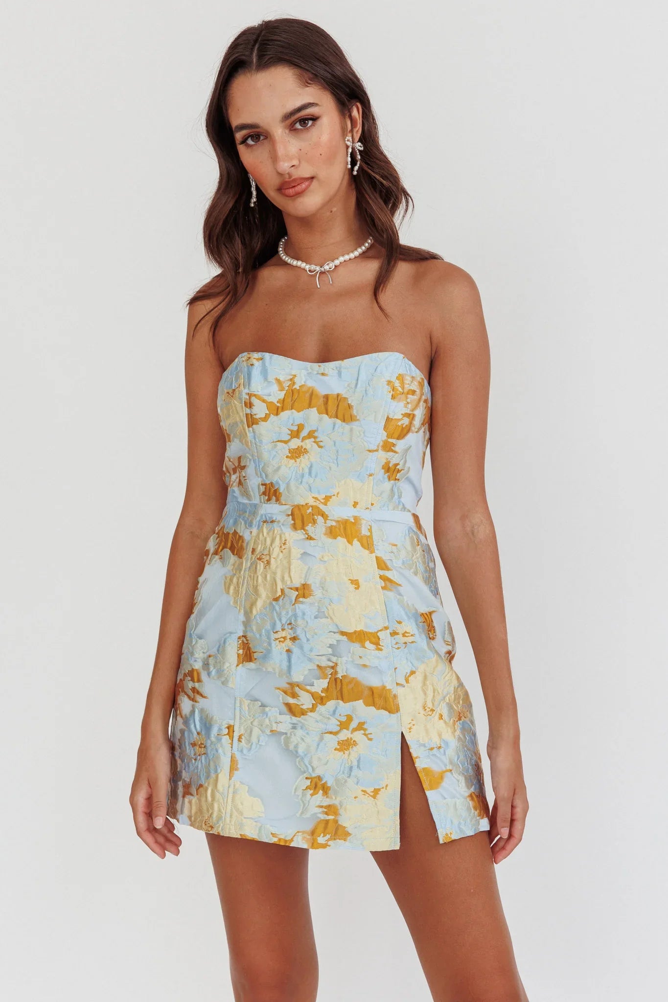 Make an entrance in our gorgeous Marlina mini dress. It features a strapless style and a pretty floral, jacquard fabric and is perfect for a birthday dinner or special event. Team it with white, strappy heels and a satin clutch for a look that will turn heads.