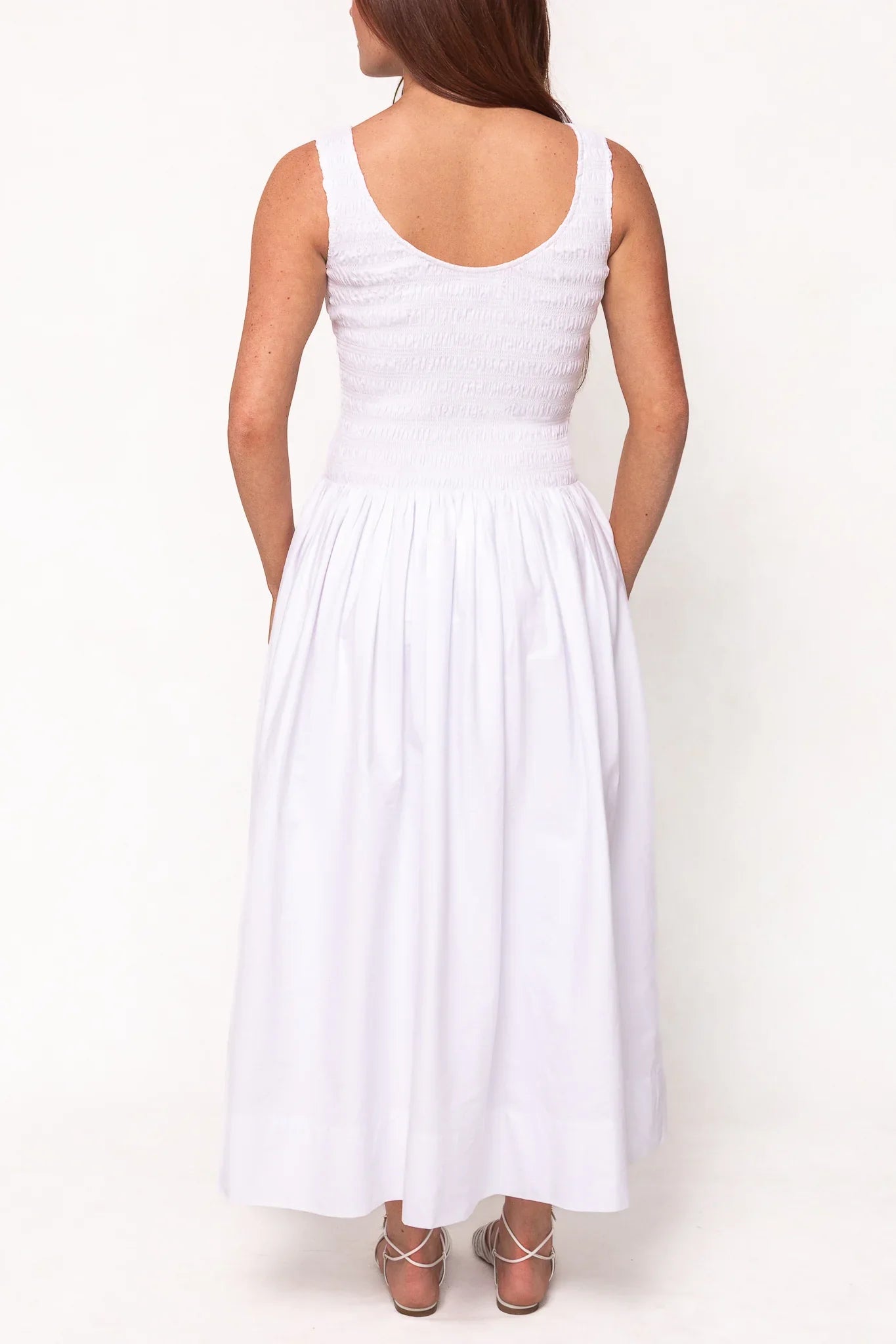 The Marlow Dress in White is your go-to cotton midi for sunny days and soft moments. With a smocked bodice, dropped waist, and pull-on stretch fit, it’s nursing friendly, maternity friendly, and endlessly comfortable. Hidden pockets add function, while the sleeveless cut and breezy silhouette keep it timeless. A warm-weather essential for every chapter of your life.