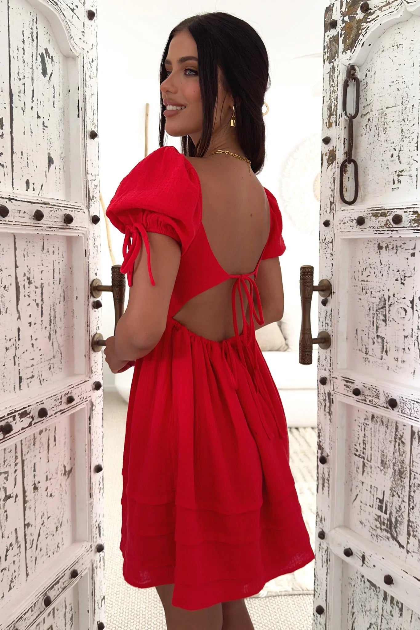 She's cute but cheeky, just how we like it! She features a low cut back detail that can be adjusted with the ruching straps, cute, short puffy sleeves with tie details and a flowy skirt style. Style her with some nude wedges and a cute tote, ready for your next picnic date with the girls.