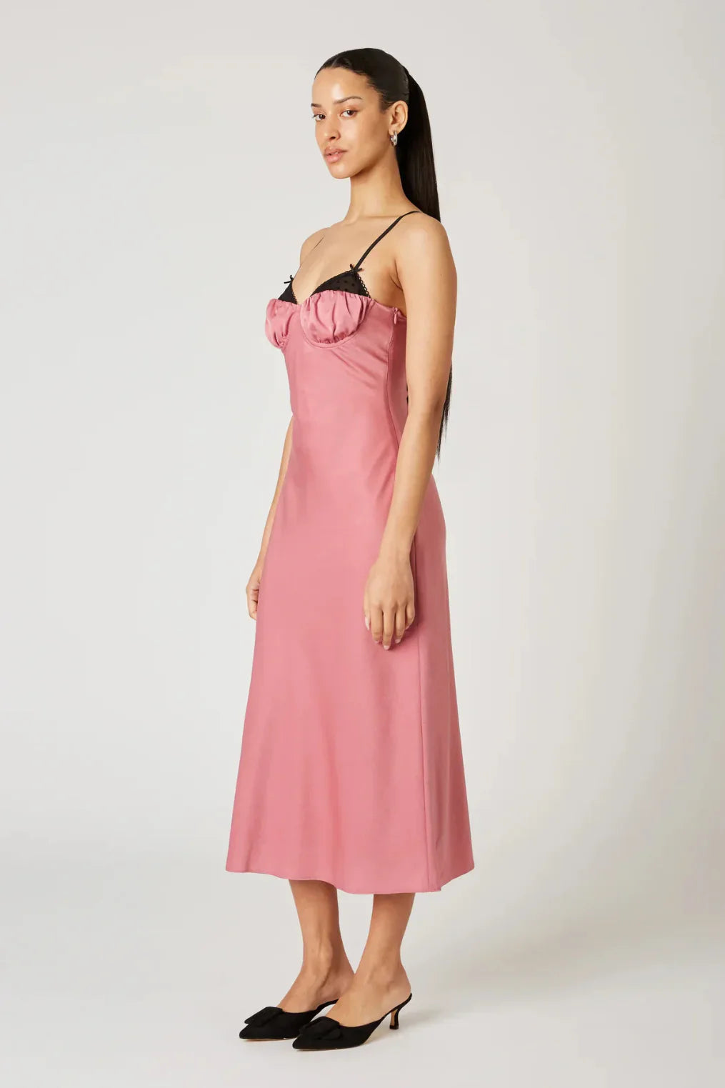 Pink satin midi dress.