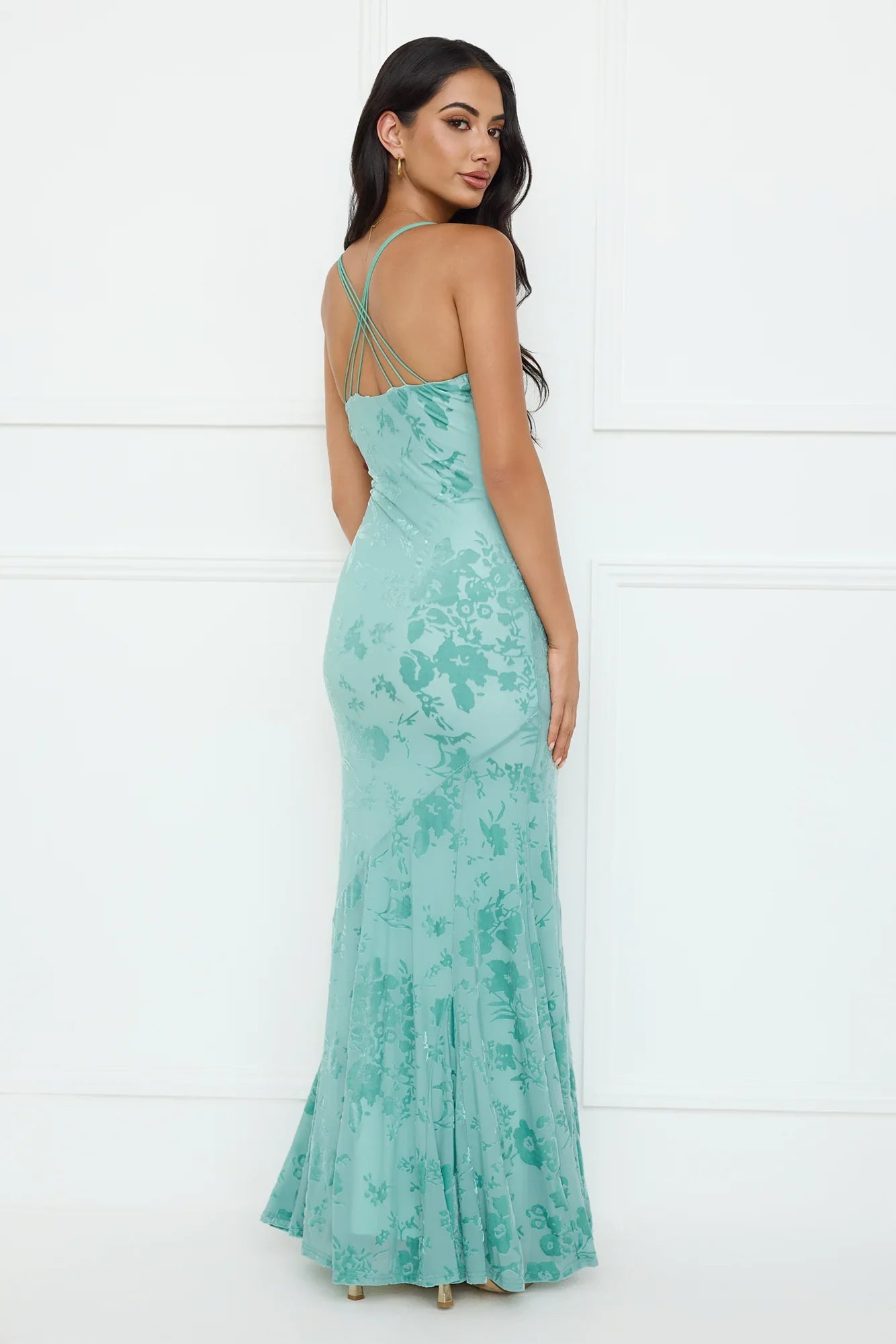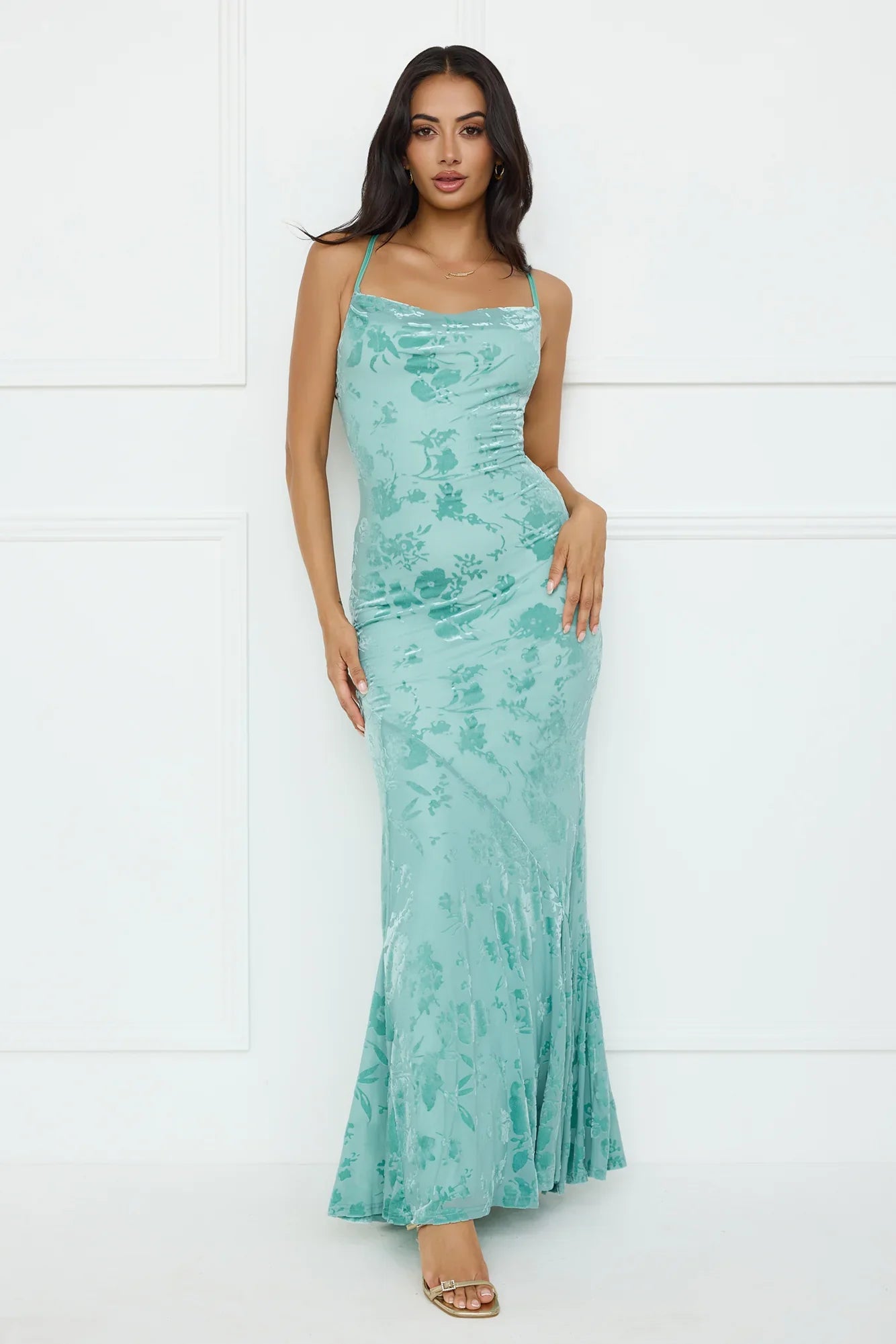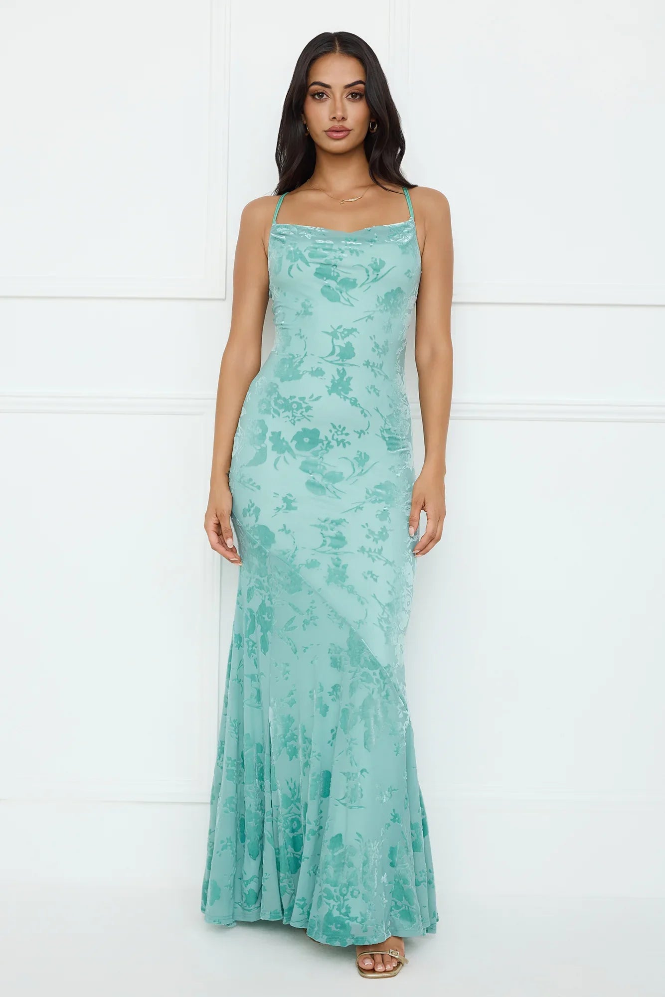 The Nocturnal Luxe Maxi Dress features a stretch velvet-like pattern with elastic cord shoulder straps, a subtle cowl neck and a flowy hem to create a dreamy look that’s perfect for any evening event. Style with heels.