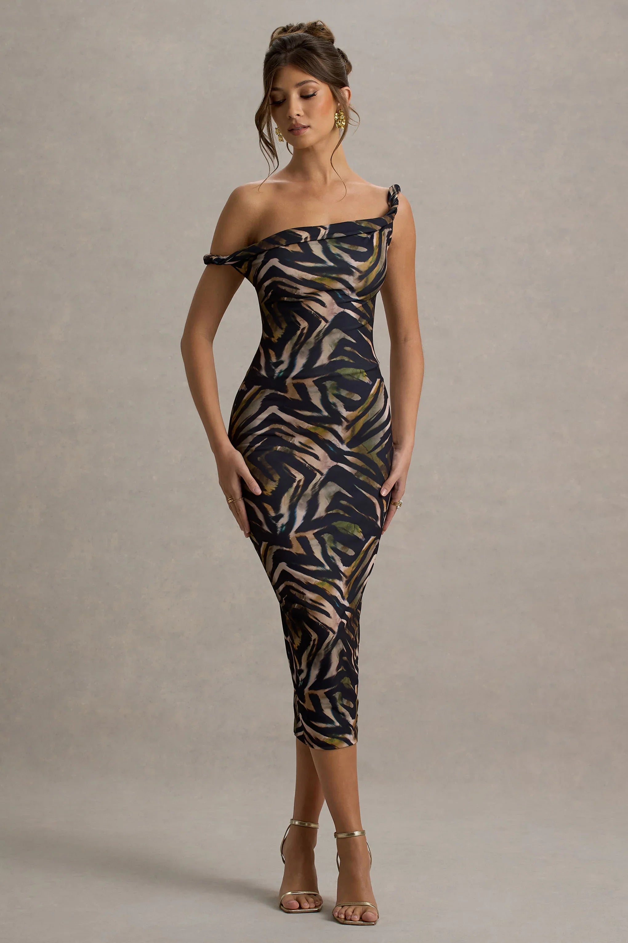 Take a trip to the wild side with Nora, our latest must-have midi of the season, painted in a trending zebra print pattern. Crafted from a premium stretch jersey fabric, this dress carries contemporary styles of asymmetric cuts and twisted necklines. Pair with your staple black heels for a chic city night look.