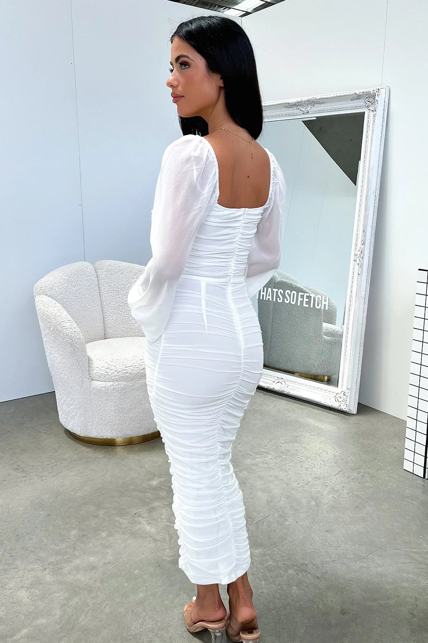 Your fave stand out dress now comes as a maxi! This babe features an all over ruched fabrication, an off the shoulder style, sheer long sleeves and is completed with an invisible back zipper. Pair her with your fave heels and gold jewellery for a look they wont forget!