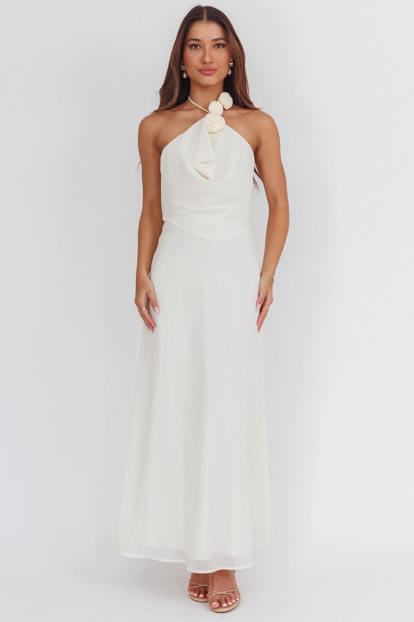Float through the room in our stunning Petronilla maxi dress. It features the sweetest rosette decorations in the neckline and is perfect for the modern bride or a special event. Team it with nude heels and a purse for a head-turning look.