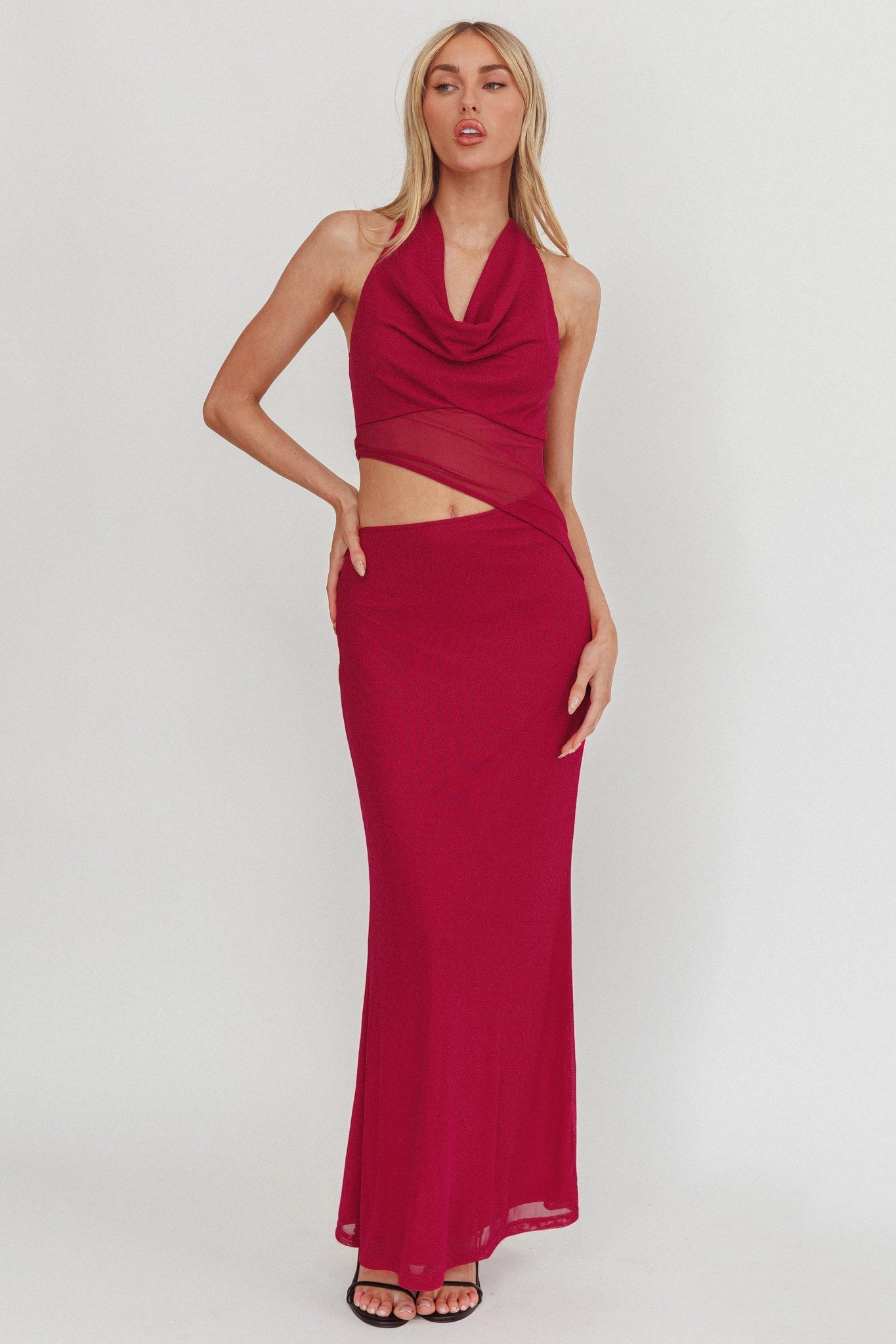 Leave an impression in our gorgeous Playing Games maxi dress. It features a halter design and cut-out waist. It's perfect for Friday night dinner and cocktails with your girlies. Team it with strappy heels and a saddle bag for an It Girl look.