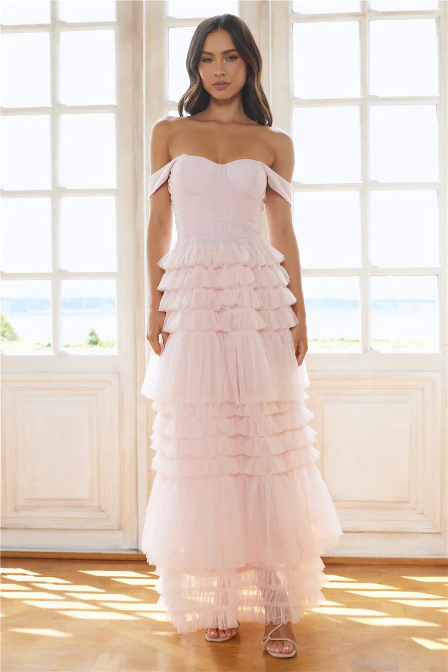Enter your princess era with the Princess Of Dreams Tulle Maxi Dress. This exclusive design features off-the-shoulder straps, boning to the bodice for a snatched appearance and a full flowy tulle skirt. Style with heels and a sparkly crown!