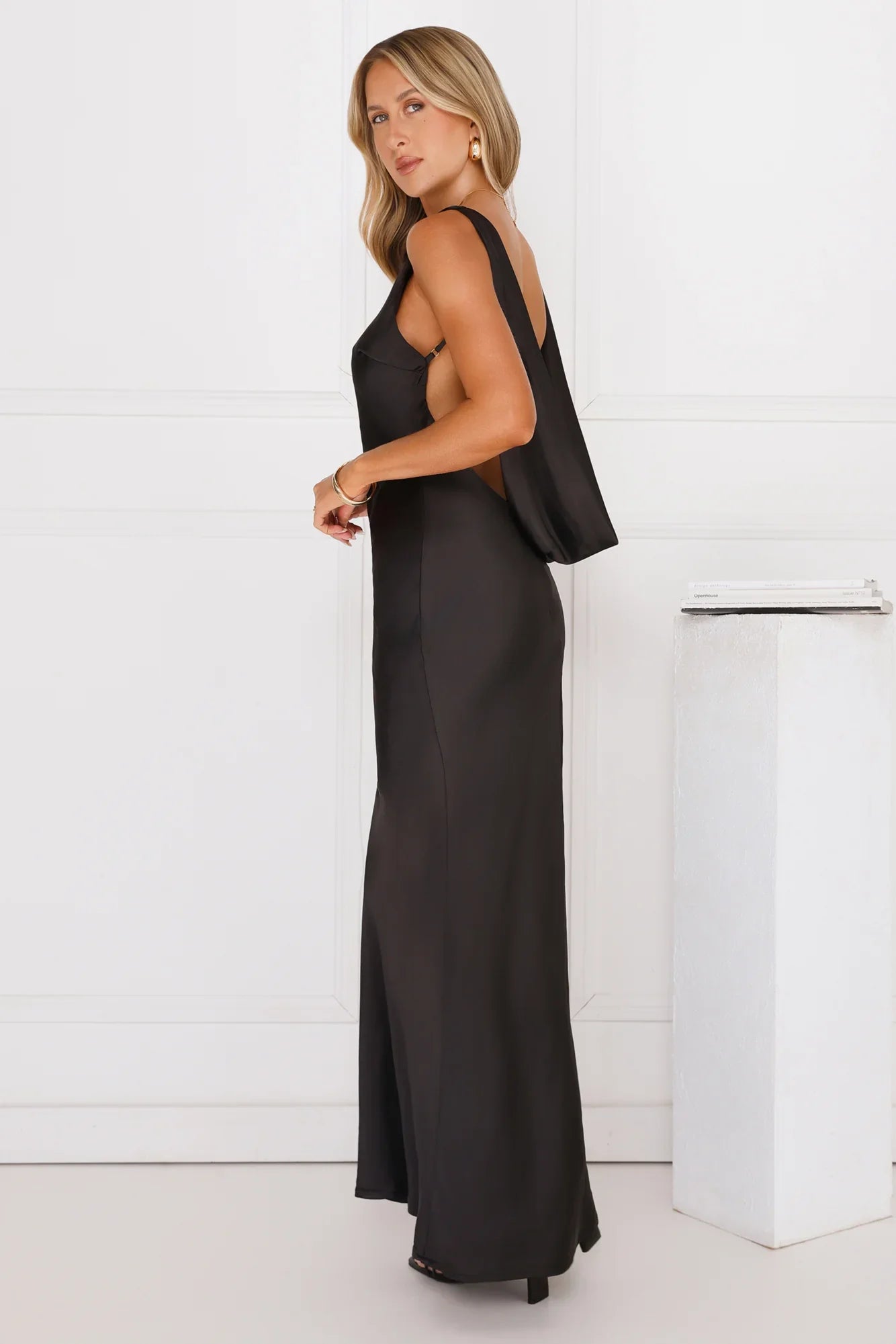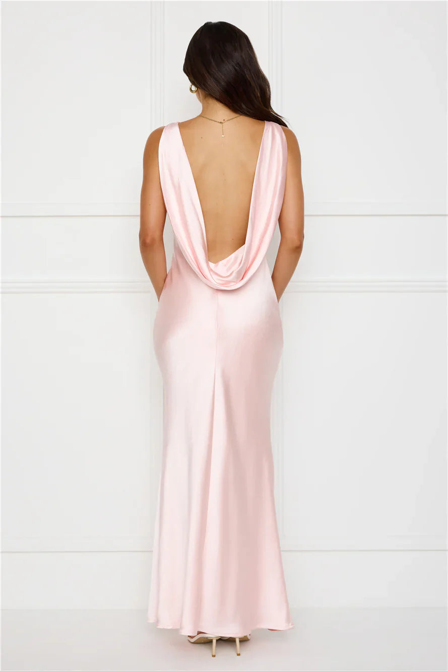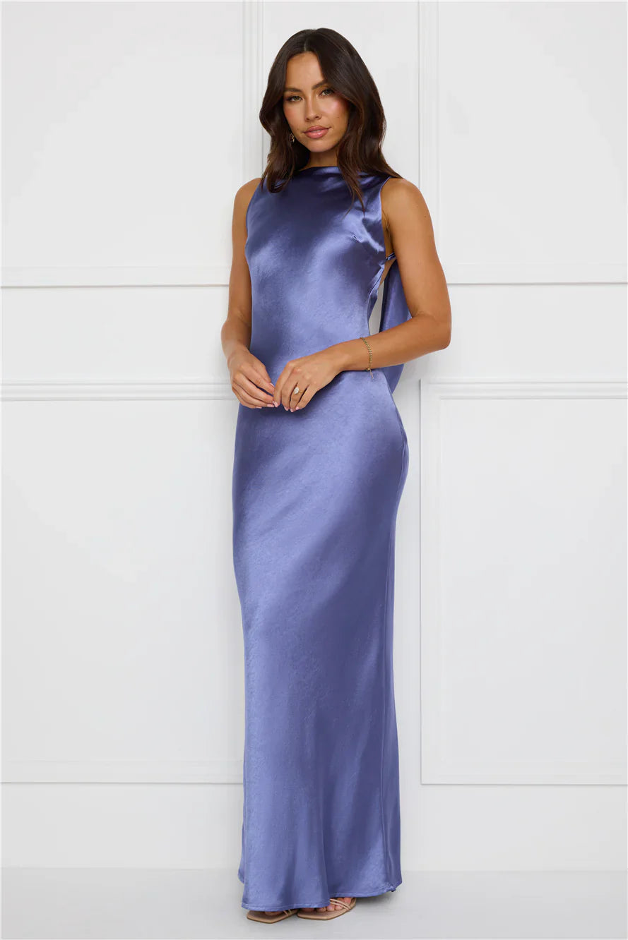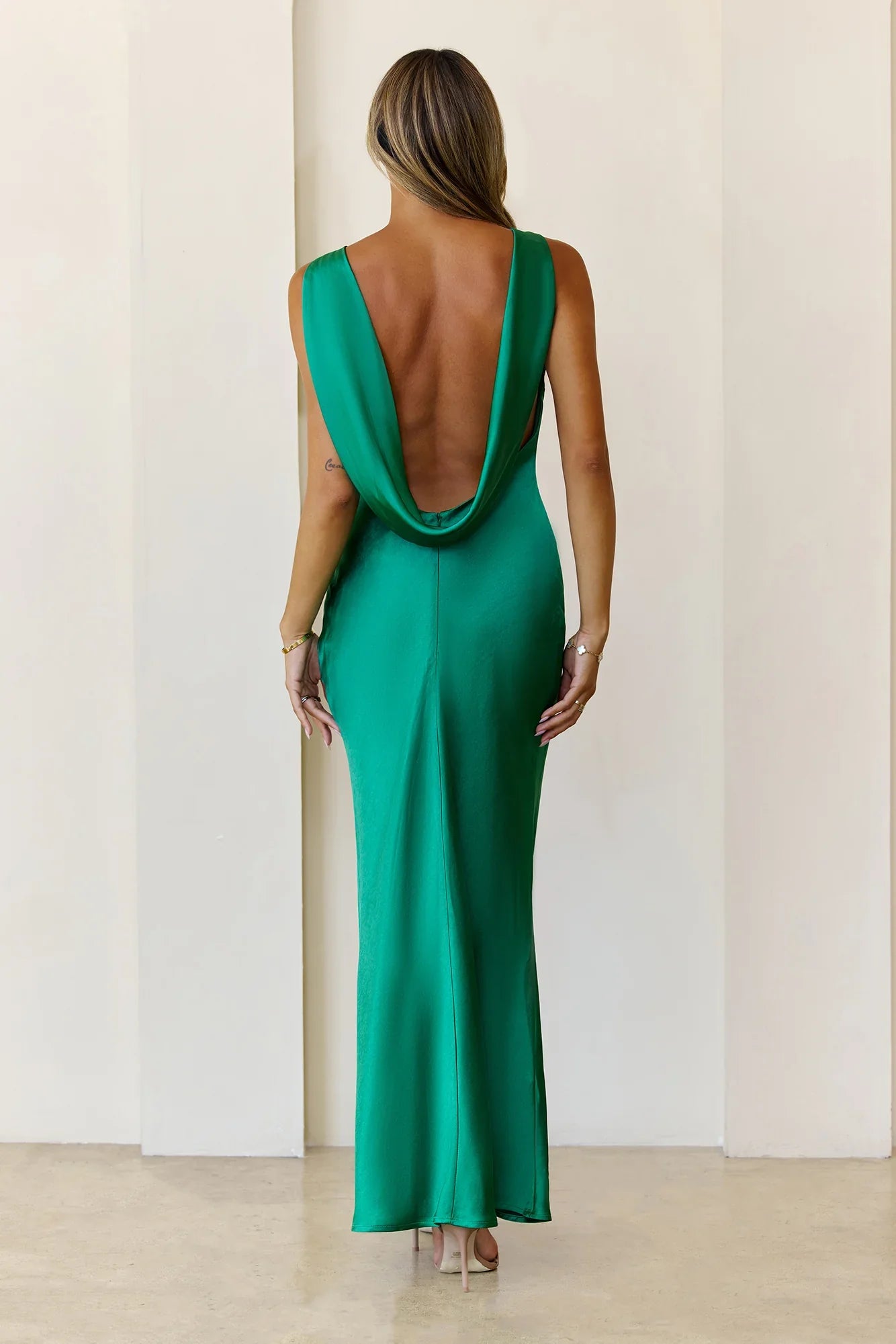 Imagine this gorgeous dress on you. The Raelyn Maxi Dress features a boat neckline, an open back and a silky satin silhouette. Style with heels and curls for all the likes!