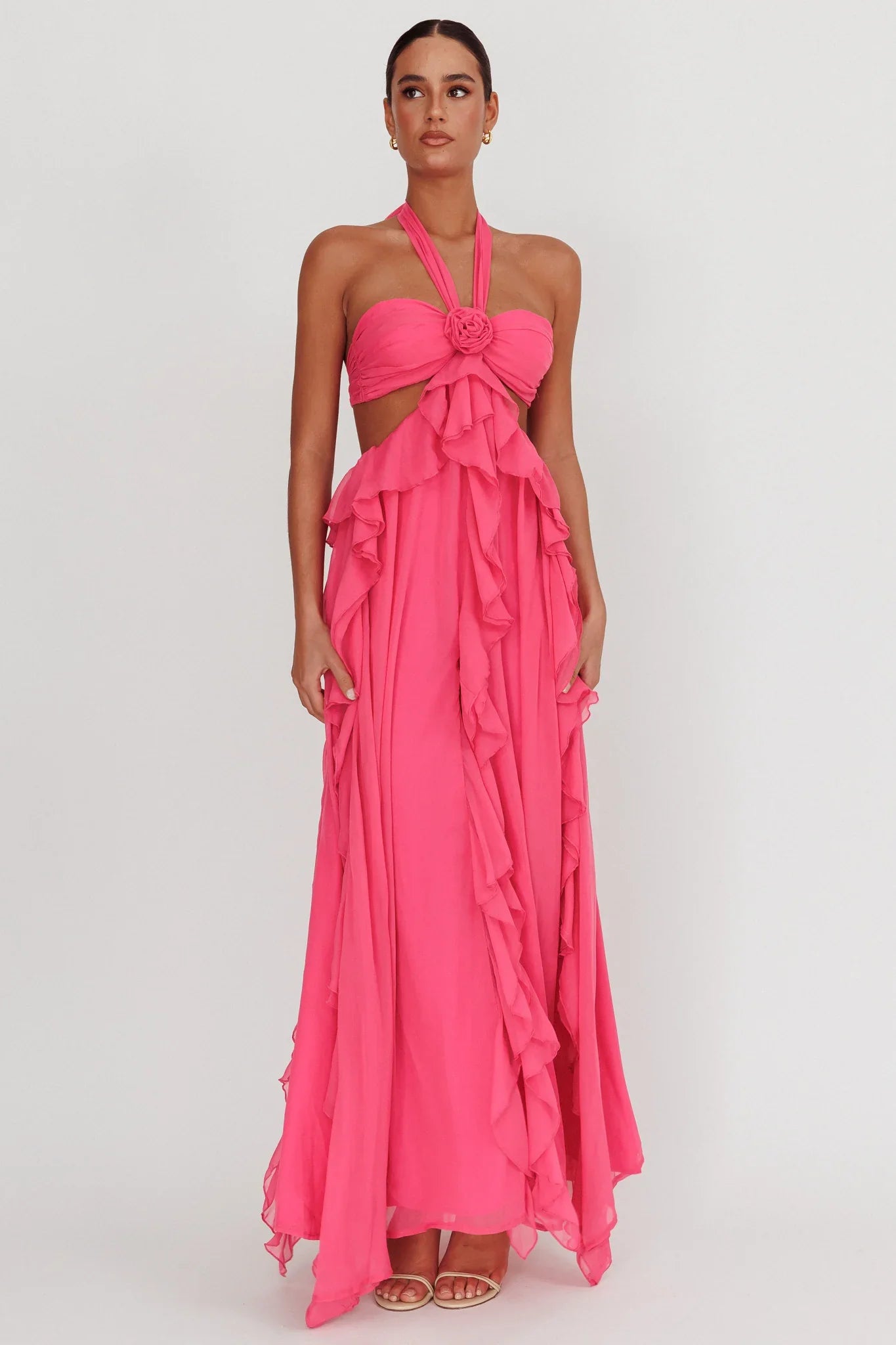 You're a real showstopper in our gorgeous Santiago maxi dress. Featuring a halter neckline and dramatic ruffle detail throughout, this one is sure to send you straight to the best-dressed list! It's perfect for a special birthday celebration or gala event. Team it with strappy, nude heels and a purse for an ultra glam look.