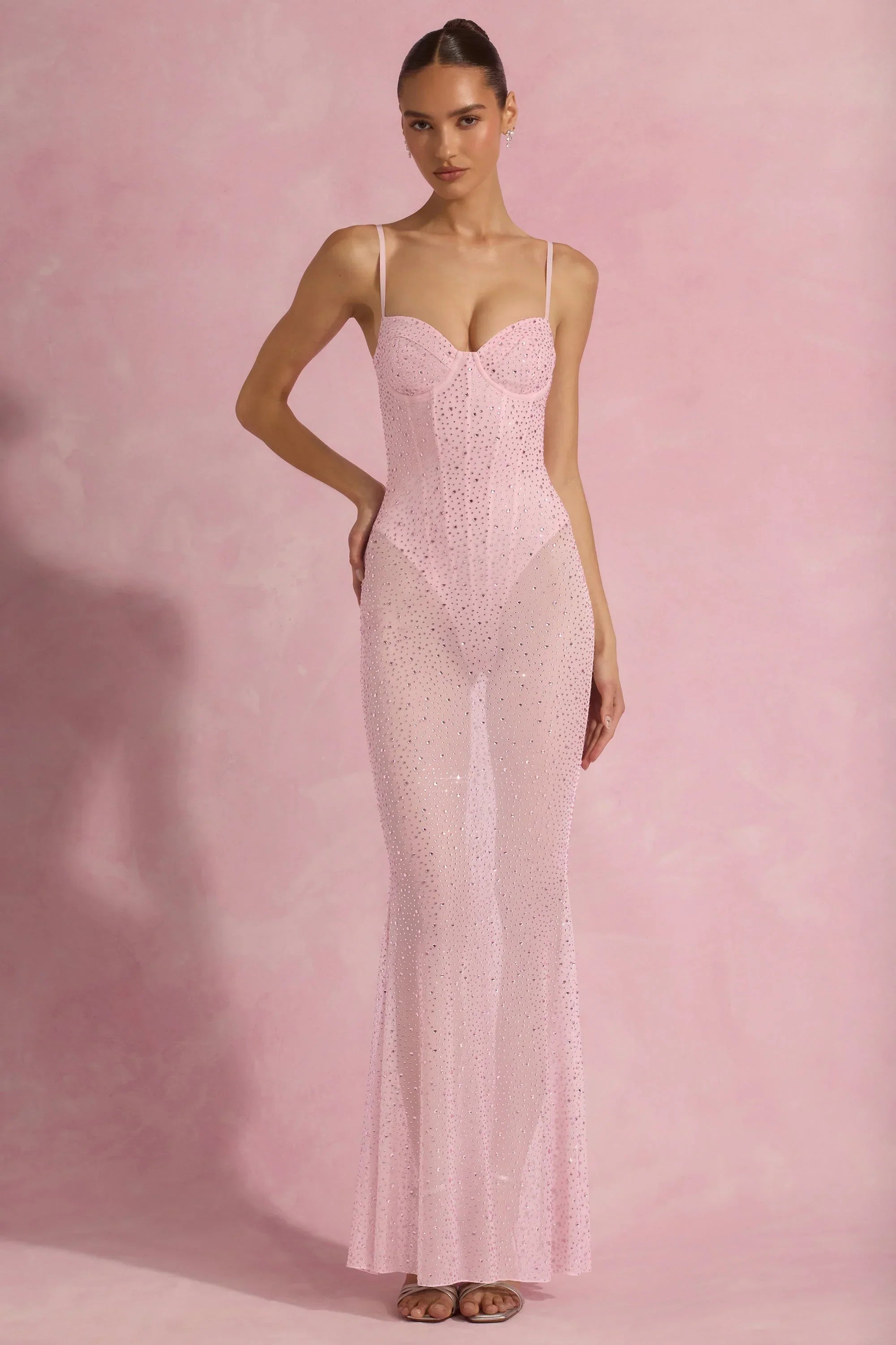 Ready for the spotlight. A head-turning silhouette, the Alara gown is crafted from premium 20D stretch mesh with a boned corset bodice and built-in bodysuit for enhanced coverage and support. It features a figure-skimming floor-length skirt with a stunning puddle train and is fully embellished with signature HOTFIX embellishments for maximum sparkle.