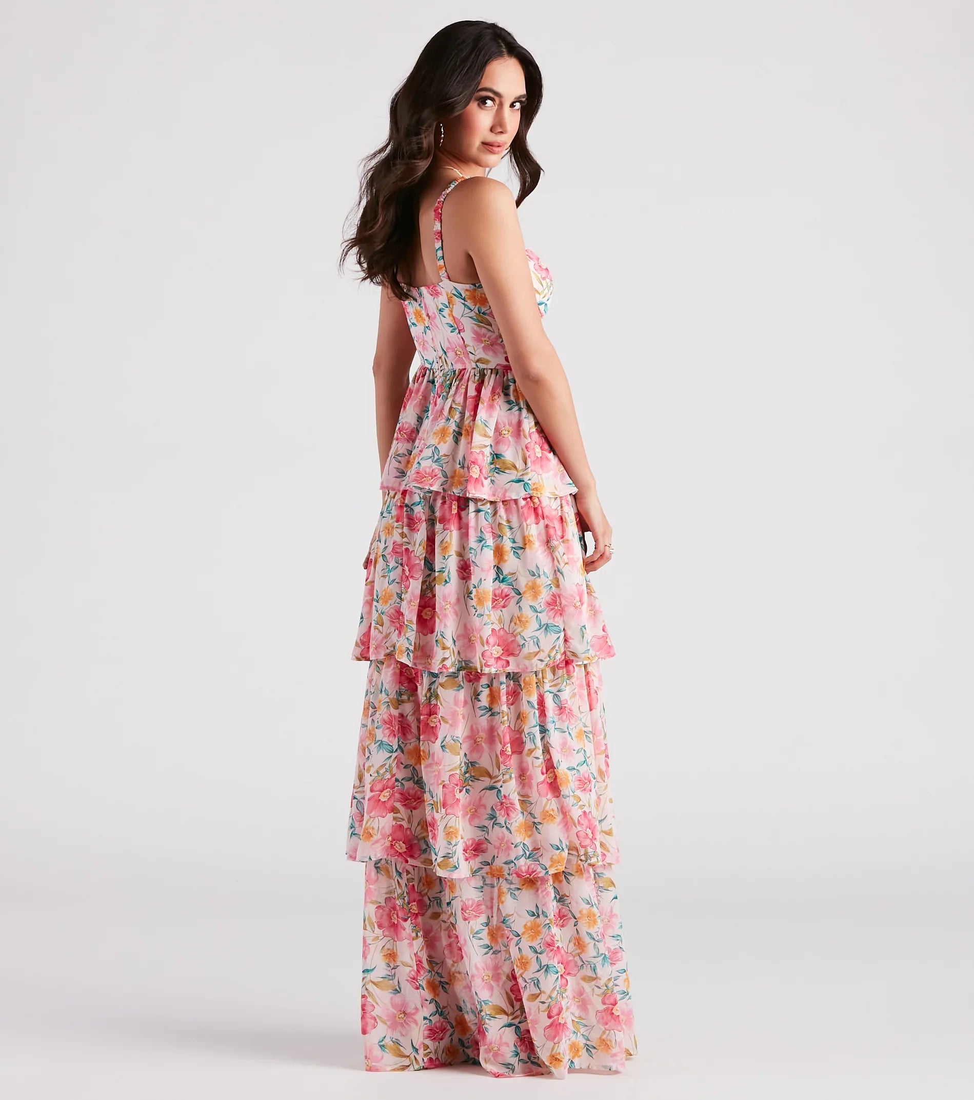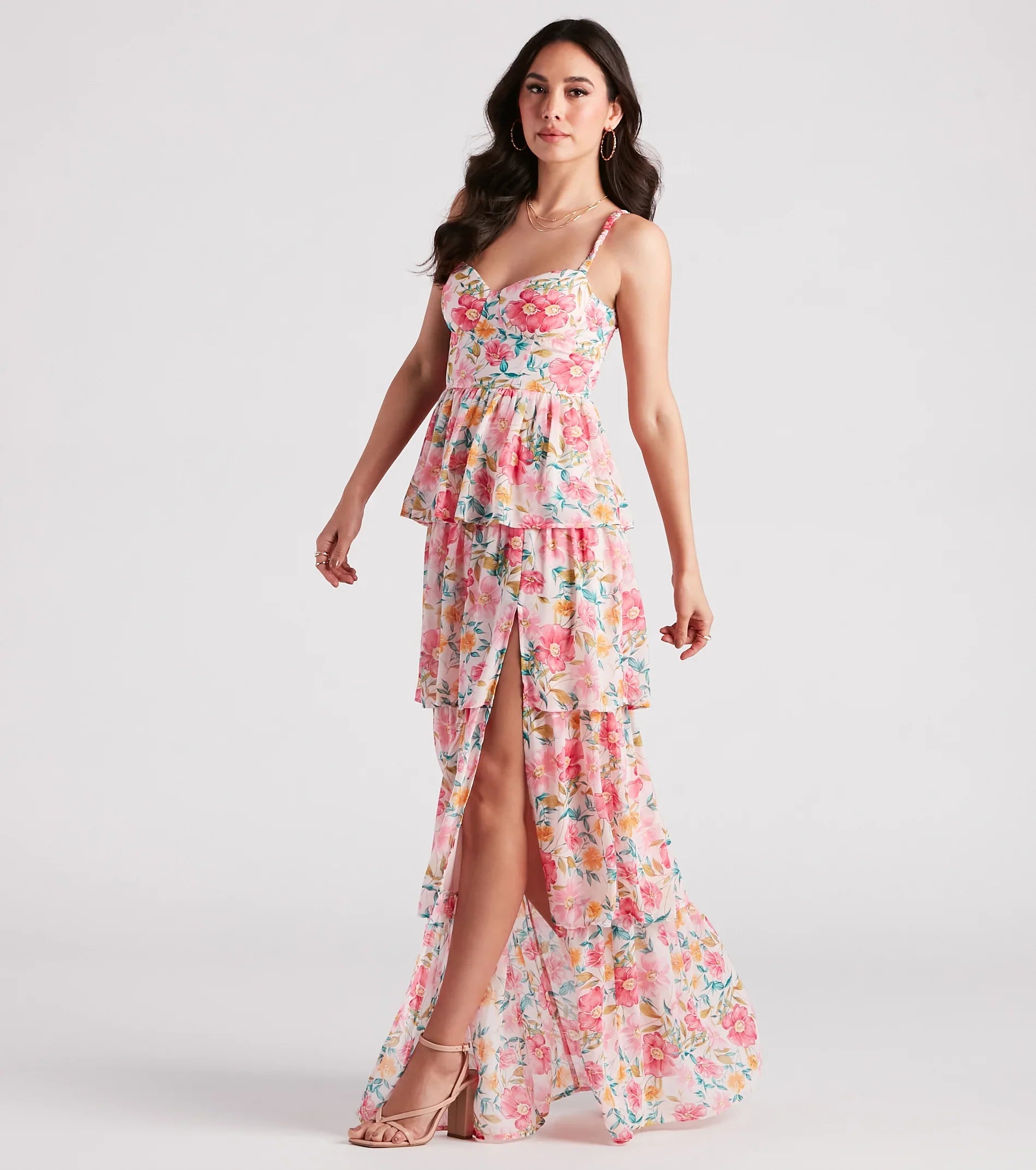 Get swept away into the dreamy romance of the Sherly formal dress showcasing a vibrant floral pattern perfect for outdoor weddings, garden parties, and formal soirees! She features a sleeveless sweetheart neckline with a padded bust, ruched elastic straps, and a ruffle-tiered A-line silhouette with a front slit and long hem. The special occasion dress is composed of an airy chiffon fabric with a stunning floral print and a smooth woven lining with no stretch. Complete the look with a and lace-up heels.