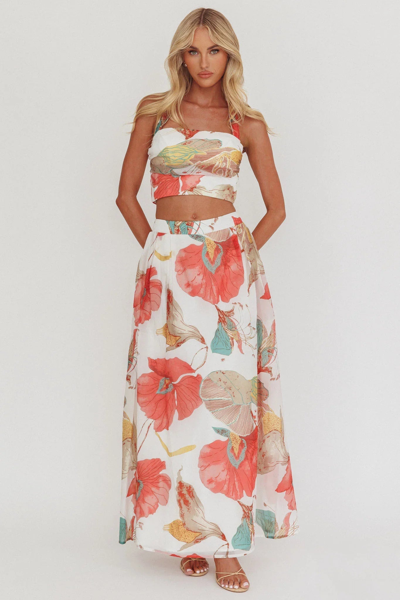 Twirl the night away in our stunning Simple Things maxi skirt. It features an A-line design and pretty orchid print fabric throughout. Wear it to a wedding or special event teamed with its matching top and kitten heels for a look that's fit for a princess.