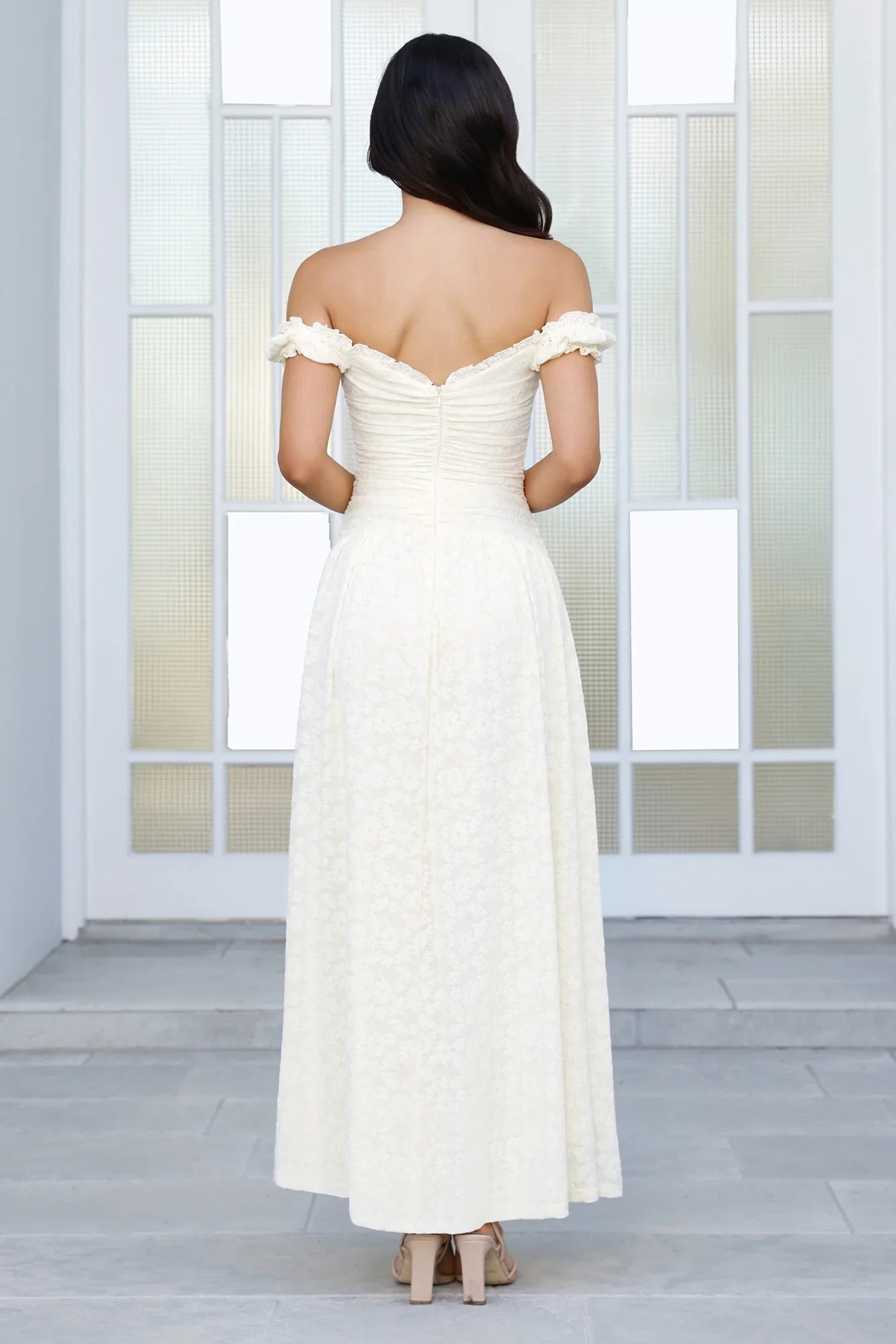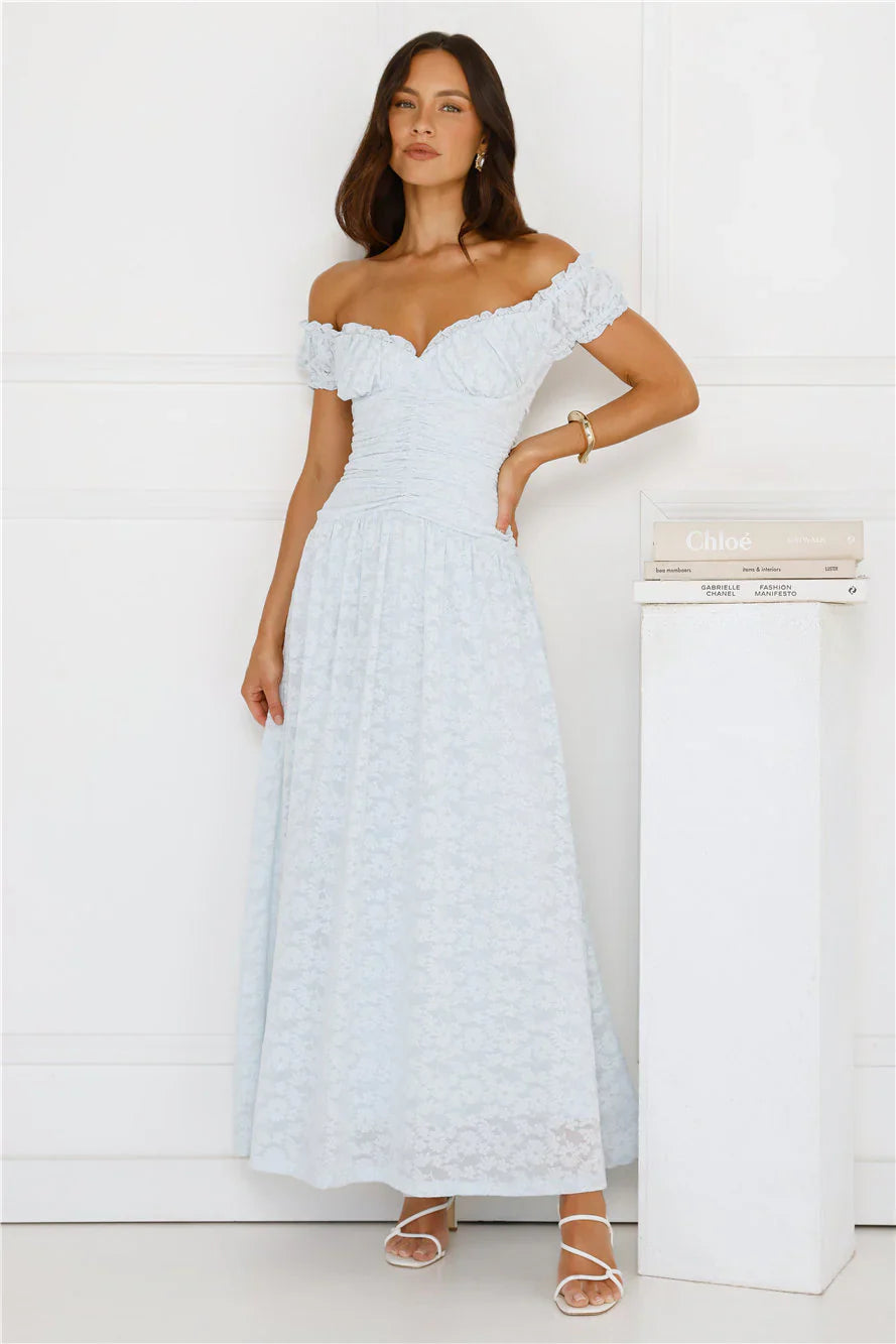 Say hello to sunshine in the Soft Serve Off Shoulder Maxi Dress, a textured beauty with an off-the-shoulder neckline, fitted bodice, flowy skirt, and stretchy elastic sleeves for that perfect flirty fit—just add espadrilles and a woven bag for the ultimate daytime dream look.