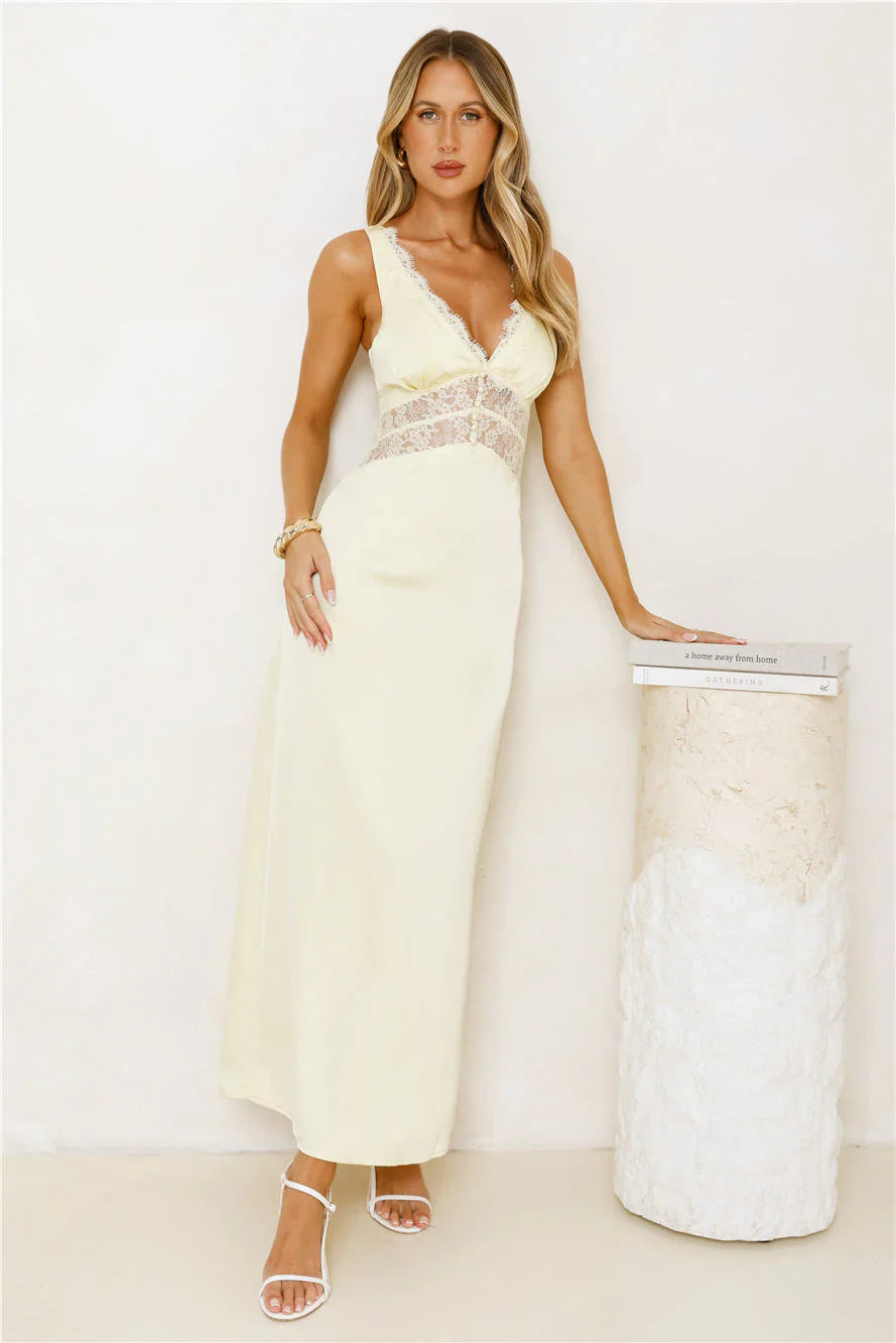The Softly In Season Satin Maxi Dress brings elegance with its satin finish, delicate lace details, faux button front, sheer bodice, and a crisscross back — perfect for glowing golden moments. Style with heels.