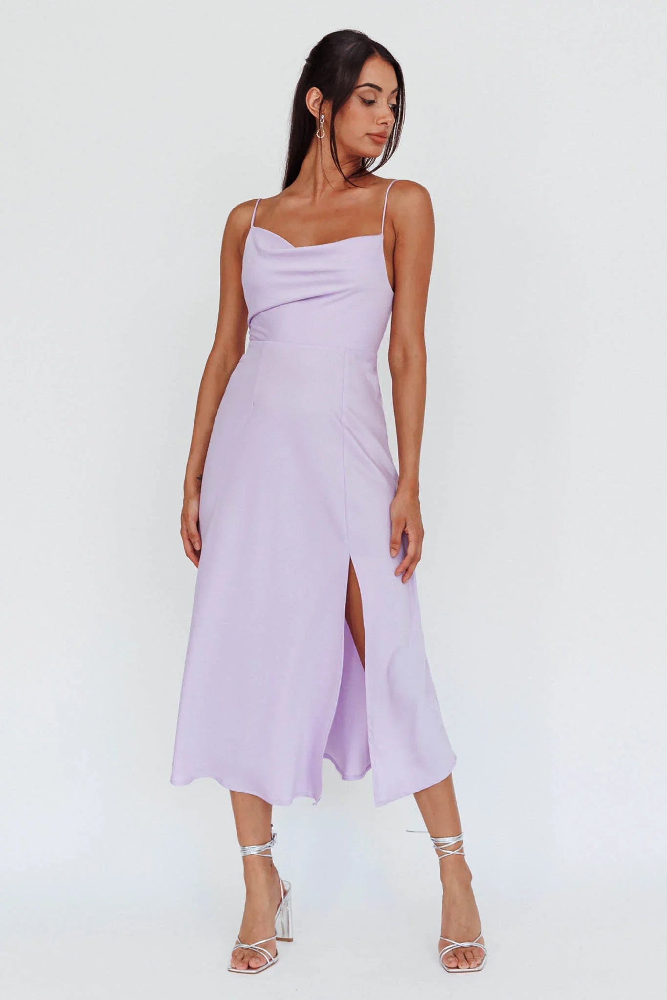 Make an entrance in our gorgeous Suki dress. Featuring a modest but classy silhouette with a sexy front split. We are in love with that cowl neckline and silky fabric. Perfect for a flirty first date teamed with nude, tie-up heels and a clutch.
