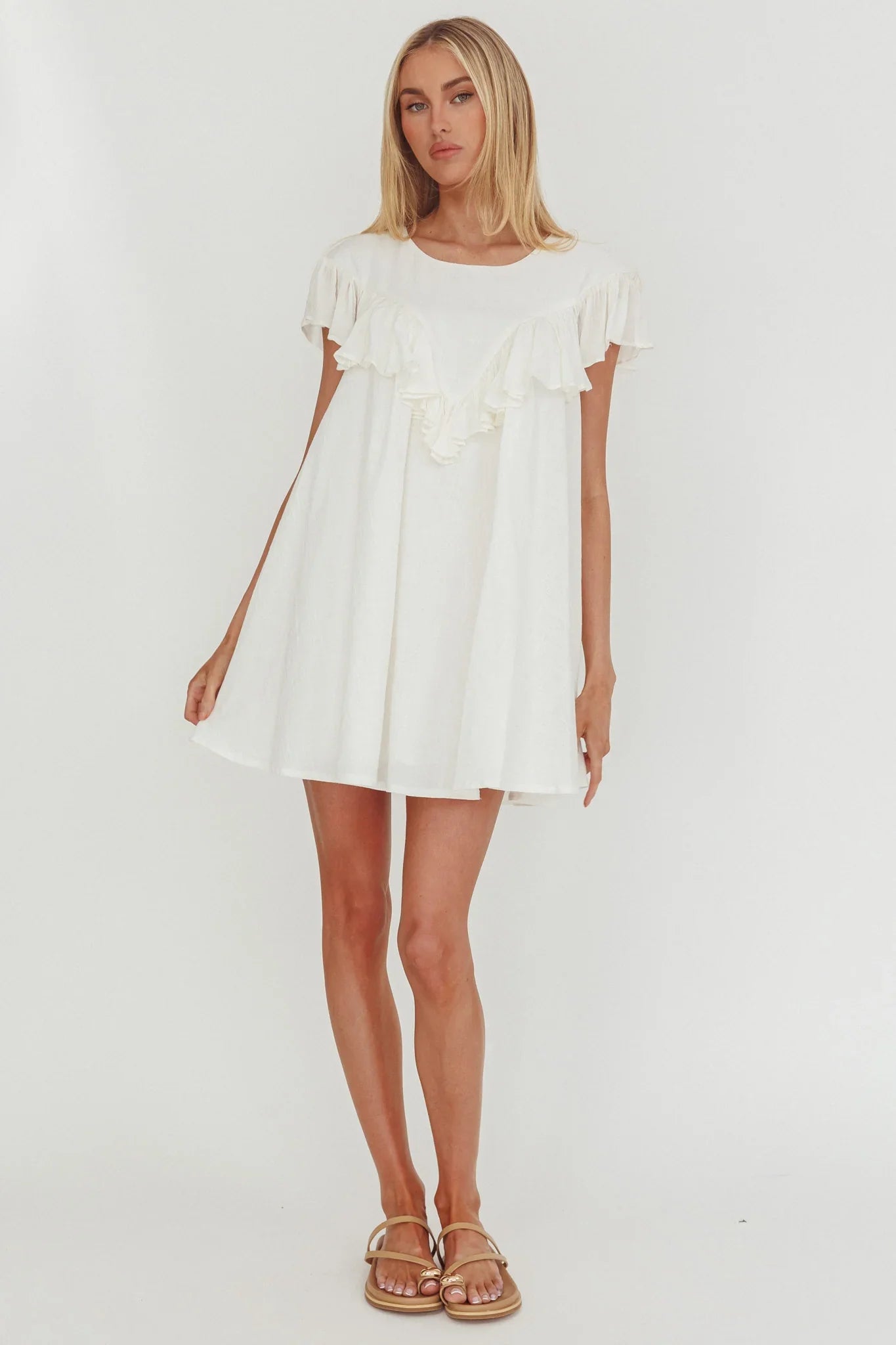Twirl the day away in our gorgeous Sunshine Weekend mini dress. It features a super cute frill trim and babydoll silhouette. It's perfect for a brunch date with your besties teamed with kitten heels and a tote for a look we are loving.