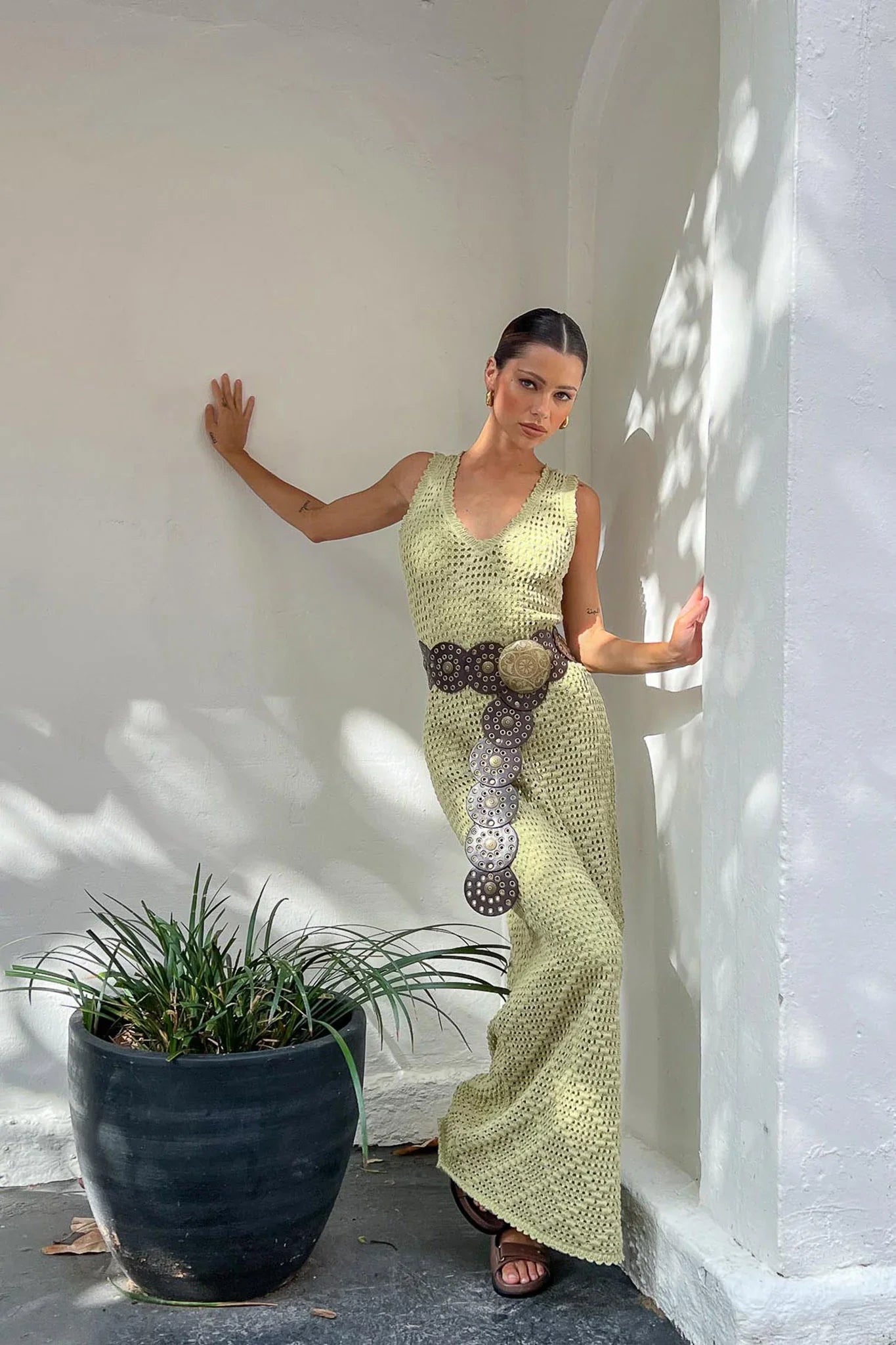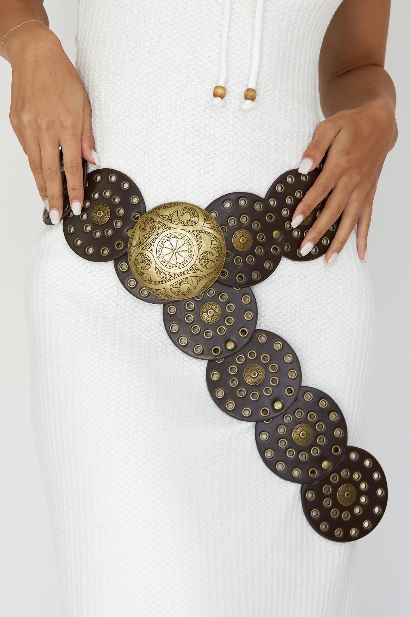 Complete your 'fit with our super cute Tina belt. We are loving its oversized circle design and brass stud hardware. Perfect for a Friday night out with your girls teamed with a midi skirt and crop tee for an It Girl look we are loving.
