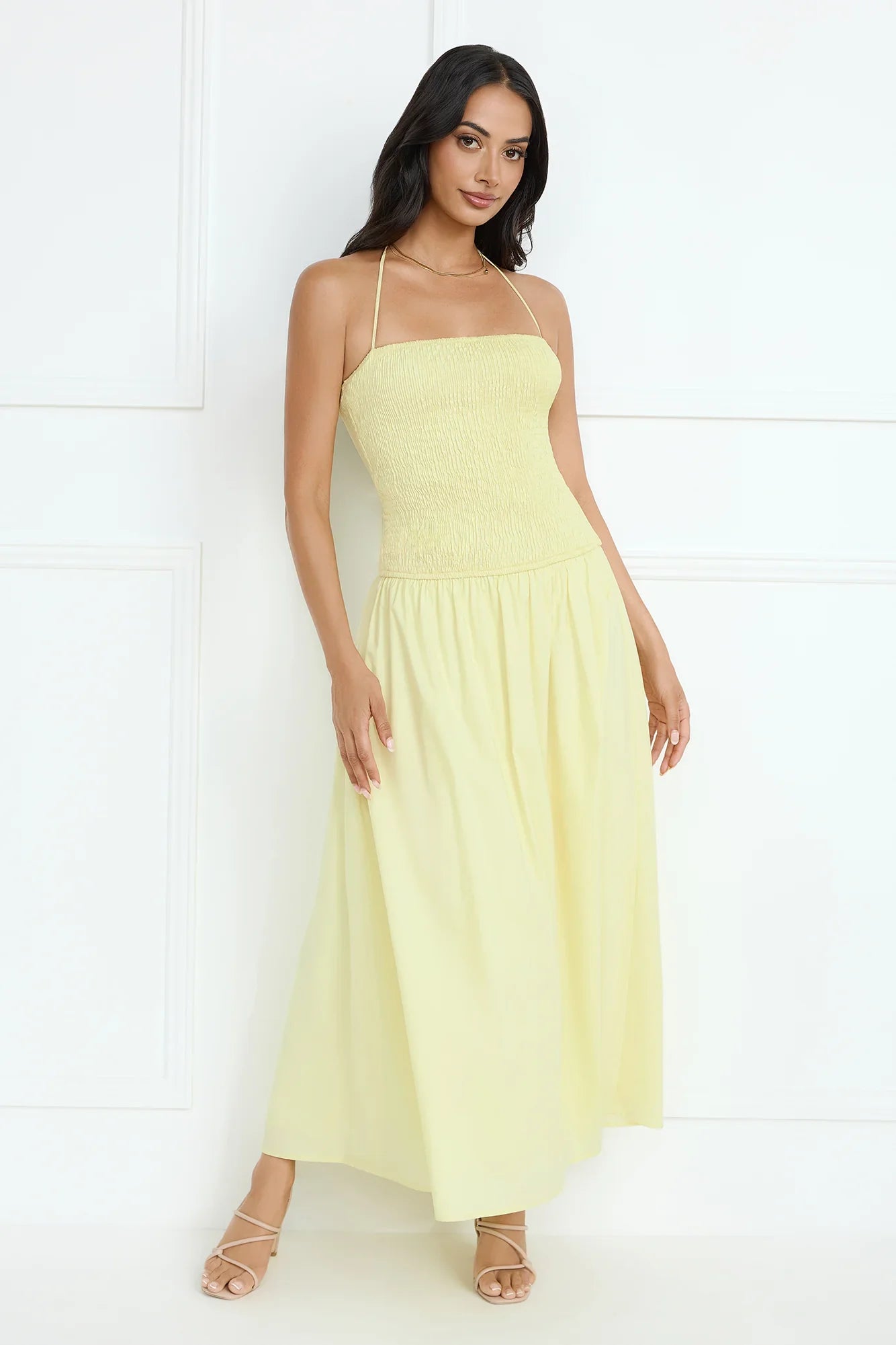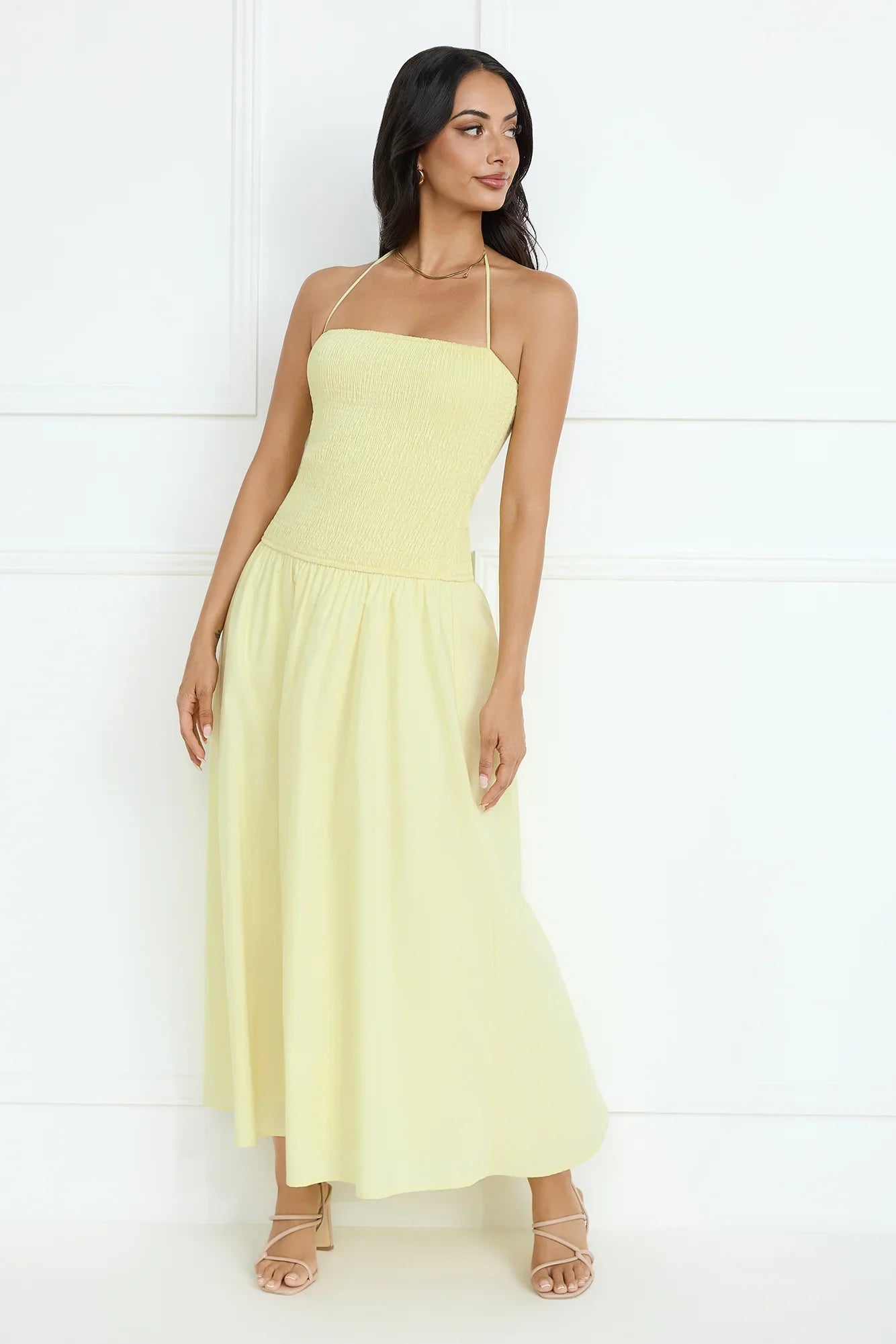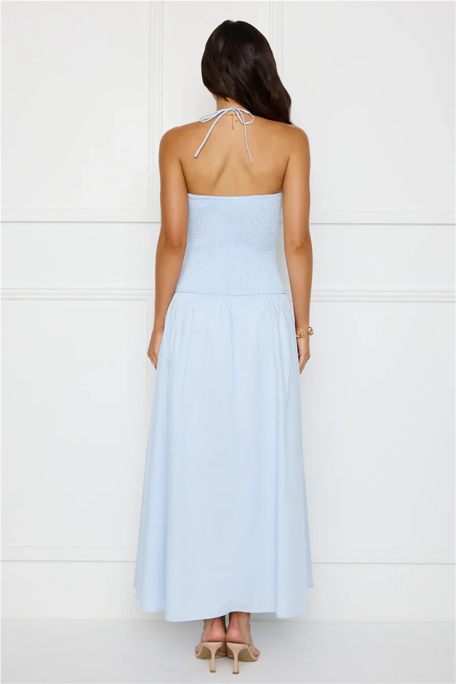 The Unmatched Energy Halter Maxi Dress is all about effortless elegance with its stretchy bodice, flattering halter tie, and soft, flowy skirt—perfect for a chic and comfortable look! Style with sandals.