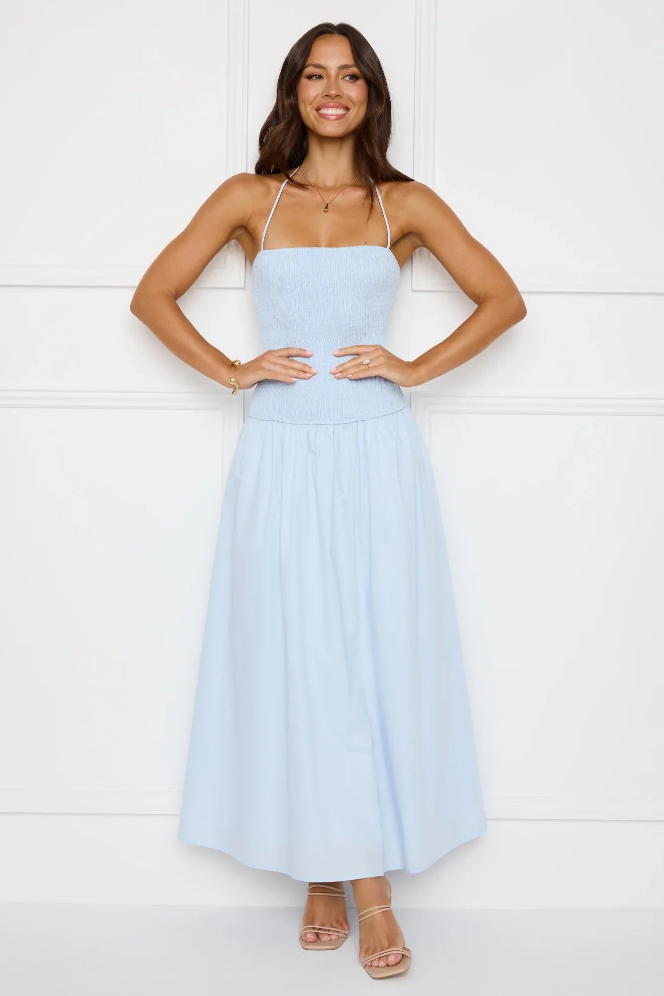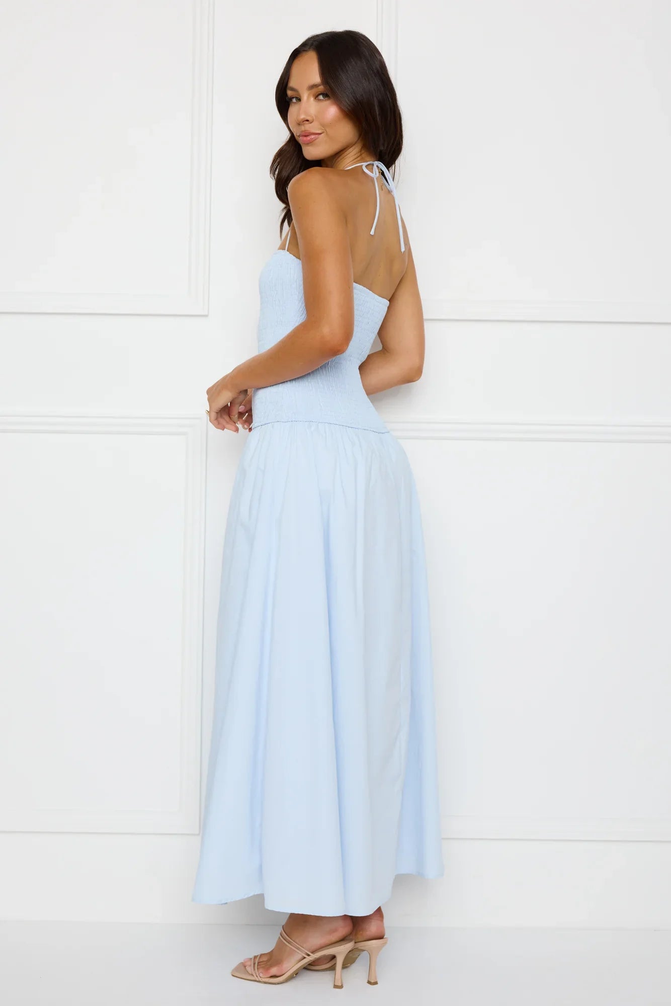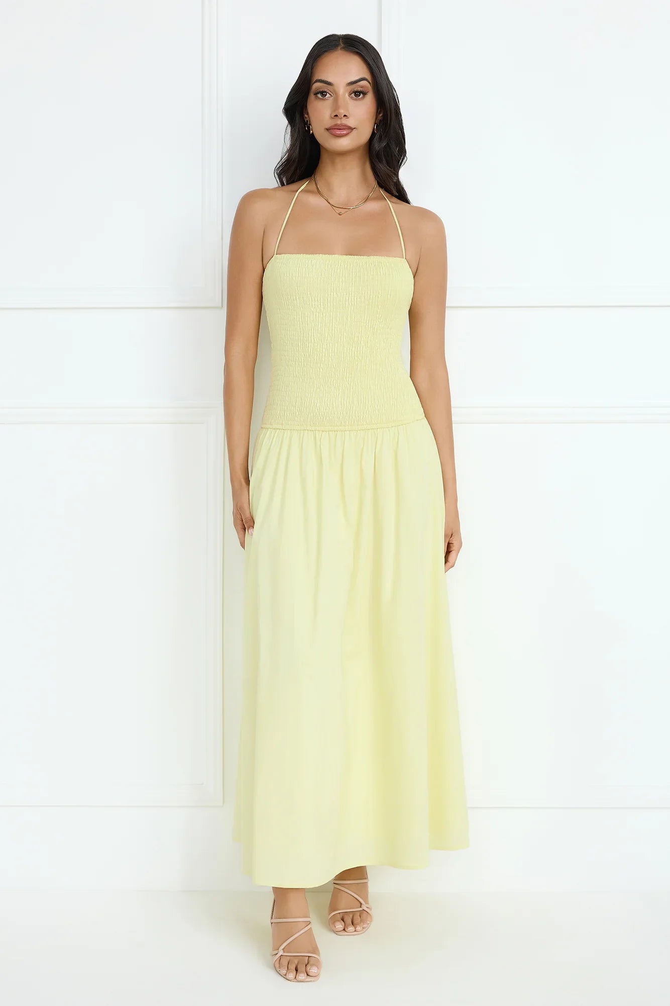 The Unmatched Energy Halter Maxi Dress is all about effortless elegance with its stretchy bodice, flattering halter tie, and soft, flowy skirt—perfect for a chic and comfortable look! Style with sandals.