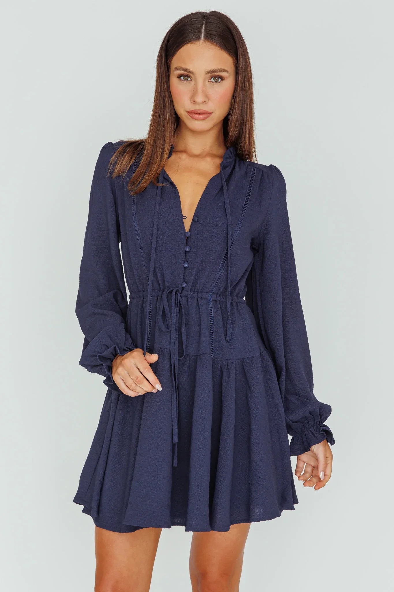 Hey there, cutie! We are in love with our adorable Waverly mini dress. Featuring long sleeves, and a drawstring waist, it's perfect for a crisp day strolling the farmers markets teamed with riding boots and a tote.